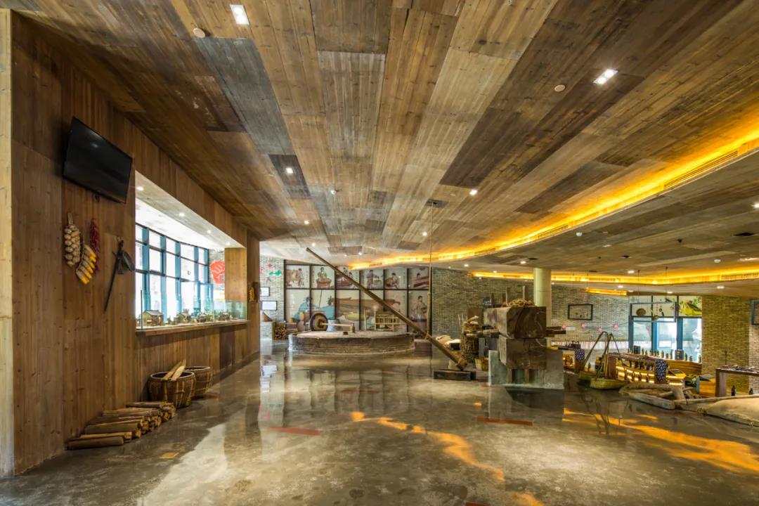 為了給游客帶來沉浸式體驗(yàn),港源裝飾項(xiàng)目團(tuán)隊(duì)在針對(duì)茶油工坊進(jìn)行室內(nèi)裝修時(shí),安排專人去當(dāng)?shù)卮迓渲兄饝魧ふ以鷳B(tài)老木板,加以梯田式屋梁造型施工,從細(xì)微之處便竭盡所能地還原我國古老文明的古樸雅致和文化底蘊(yùn)。