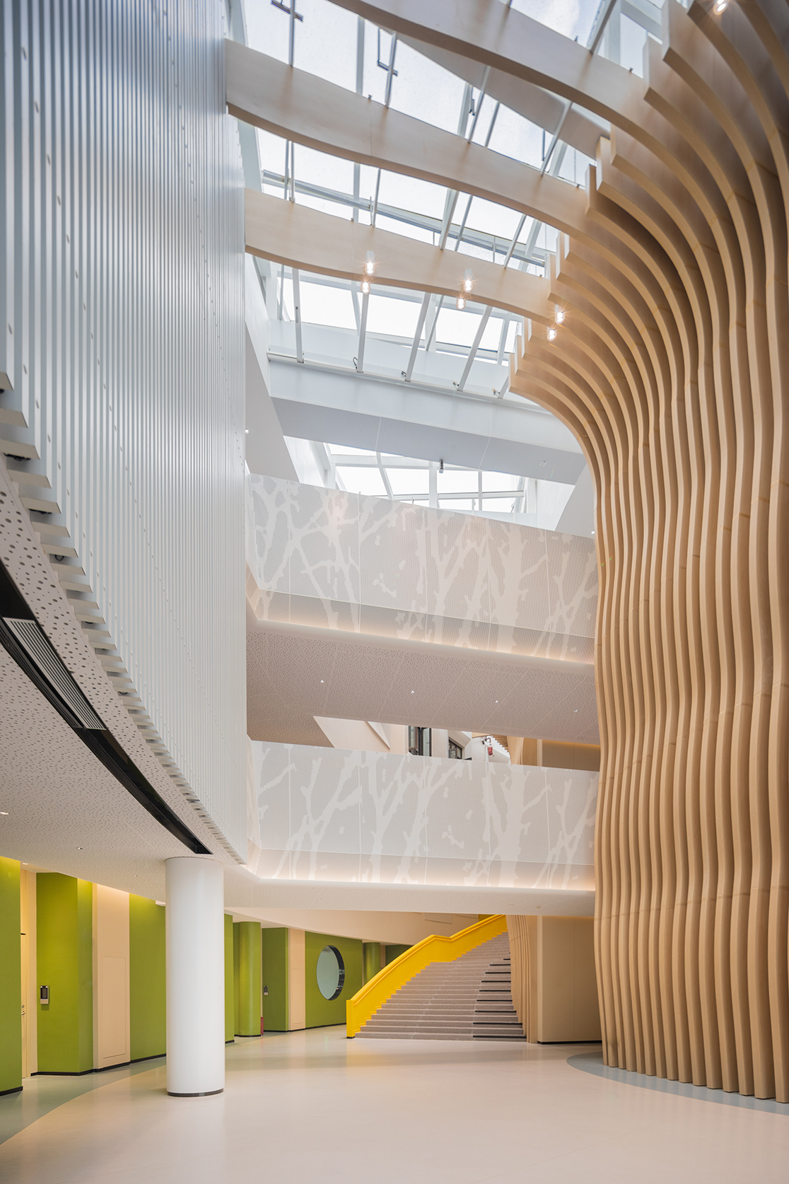 博雅樓是亮亮中學的科技藝術區(qū),室內(nèi)設計及施工融合”景觀+生態(tài)+文化”三大元素,特別是在中庭區(qū)域,“樹狀”造型包繞著整個墻面,充分展現(xiàn)了這座建筑的藝術沉浸感。但面對弧形的墻面、復雜的形態(tài)及高低起伏的樓梯,異形鋁方通的下單制作及安裝便成了整個區(qū)域一大難題。港源裝飾項目團隊以豐富的施工經(jīng)驗,充分考慮了鋁方通重量及變形度,在現(xiàn)場對原設計圖紙重新排版分段,反復精細測試,最終完美呈現(xiàn)出這片高達14米的樹狀造型。