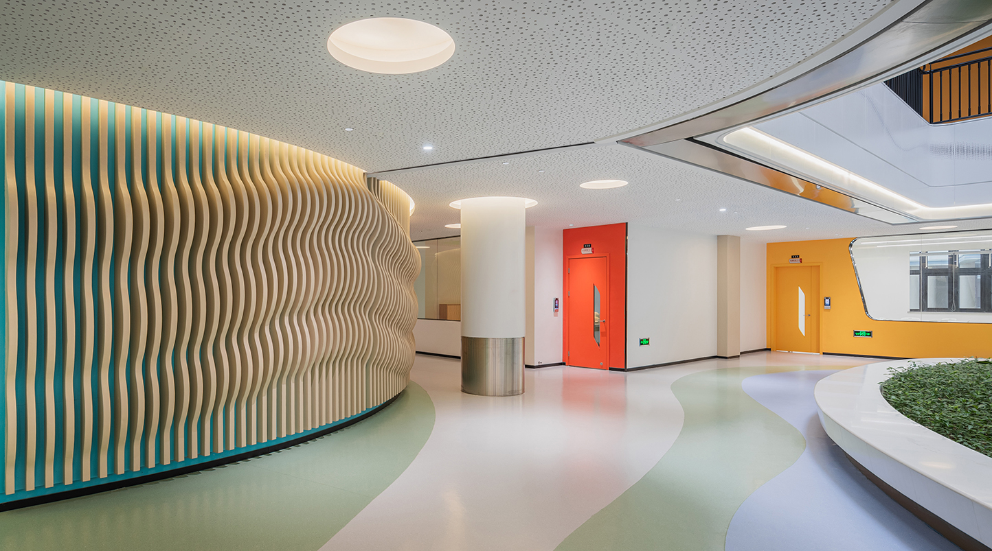 校園環(huán)境關乎著每一位孩子的身心健康,因此,學校建設更應嚴格強調(diào)工程質(zhì)量的安全環(huán)保。對于這一方面,港源裝飾與甲方的意見高度統(tǒng)一,因此仿木紋金屬墻面便成為亮亮中學室內(nèi)環(huán)境的重要材質(zhì)。仿木紋金屬墻面不僅有極佳的質(zhì)感,而且具備環(huán)保、防潮、抗菌等優(yōu)勢,但金屬材質(zhì)易變形的屬性也同時存在。為了堅持環(huán)保優(yōu)先原則,港源裝飾團隊反復論證,決定增加輕鋼龍骨等基層處理工序來保障金屬墻面的平整度及垂直度,并且達到了易于拆裝、降低維護成本的目的。
