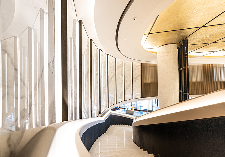 項(xiàng)目各個(gè)空間造型繁多、線條復(fù)雜,工期雖緊但無(wú)法批量生產(chǎn)部件,現(xiàn)場(chǎng)安裝也要求十分精準(zhǔn)。具備豐富施工經(jīng)驗(yàn)的港源項(xiàng)目團(tuán)隊(duì),在開(kāi)工之前就協(xié)調(diào)各類材料廠家介入,共同討論工藝做法,以充足的施工協(xié)調(diào)能力爭(zhēng)取出大量的構(gòu)件加工及精細(xì)施工時(shí)間。