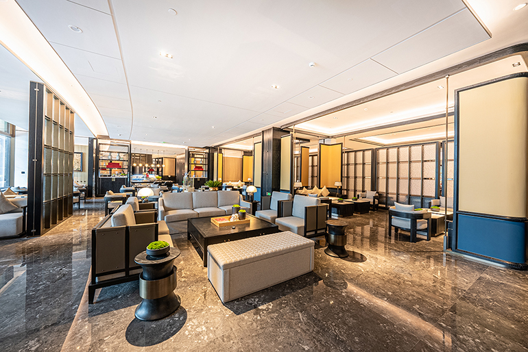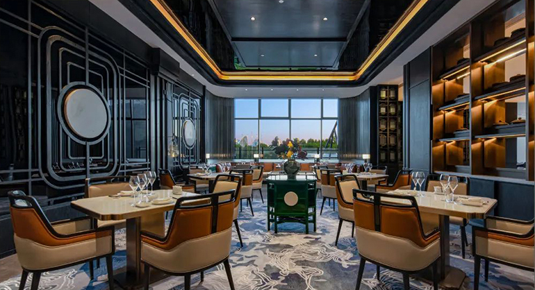 這是一座無(wú)法批量施工的項(xiàng)目:氣勢(shì)恢宏的無(wú)柱宴會(huì)廳、素潔靜雅的辰山中餐廳、中西合璧的新福席特色餐廳……每個(gè)空間都有其獨(dú)特的美學(xué)蘊(yùn)含,僅在港源施工范圍內(nèi)的空間就涉及