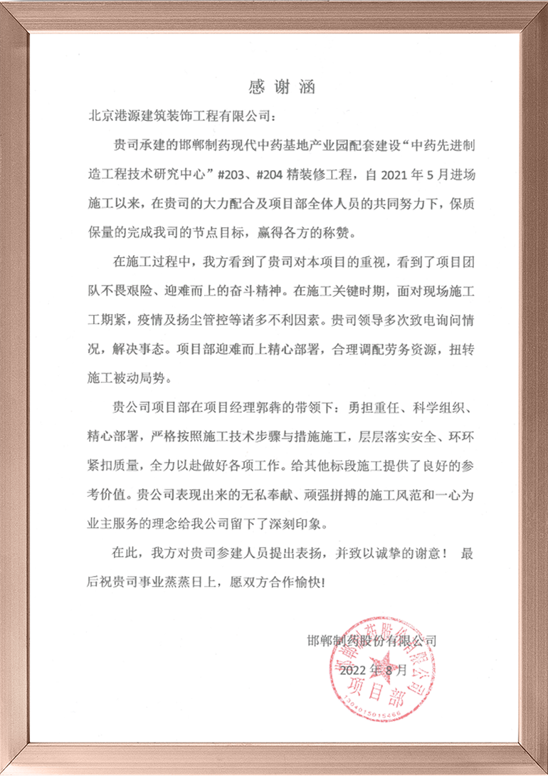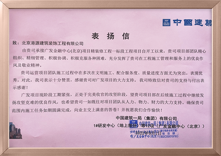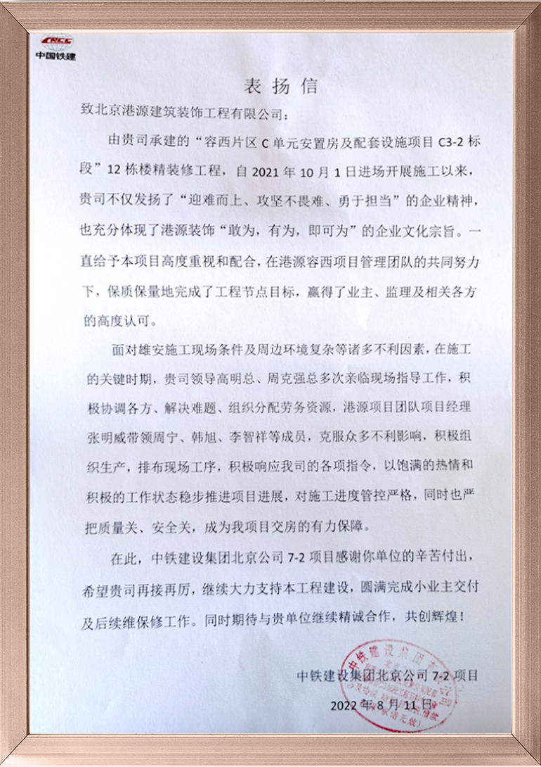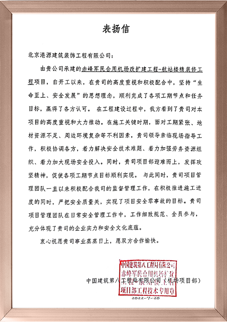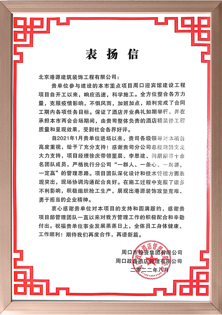 2022上半年,港源裝飾歷經(jīng)重重考驗,一以貫之地發(fā)揚契約精神及頑強奮戰(zhàn)的鐵軍作風(fēng),始終堅持“讓客戶更滿意”的企業(yè)宗旨,奮力完成了各項既定目標(biāo)。一封封表揚信,承載著業(yè)主的支持和贊譽,也是對港源裝飾誠信履約的最好詮釋。